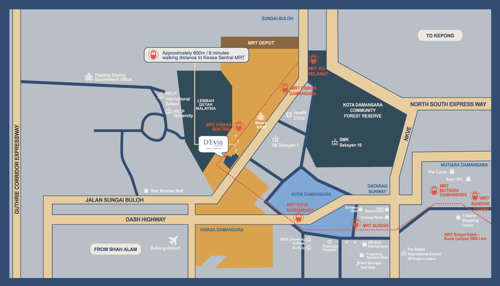 D’Evia Residences is strategically located within Kwasa Damansara, a master-planned township in Selangor that is designed to support integrated residential, commercial, and lifestyle development. The residence is situated near Kwasa Sentral MRT Station, providing convenient public transport connectivity to Kuala Lumpur and surrounding areas within the Klang Valley. Residents can also access major highways such as the NKVE, DASH, and LDP, making daily travel to nearby hubs like Petaling Jaya and Kuala Lumpur more convenient. With its position close to retail outlets, parks, and future commercial centres within Kwasa Damansara, the location offers a balanced combination of connectivity, accessibility, and everyday convenience.
